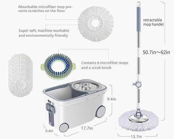 Spin Mop Bucket Deluxe 360 Spinning Floor Cleaning System with 6 Microfiber Replacement Head Refills,62″ Extended Handle,4X Wheel for Home Cleaning