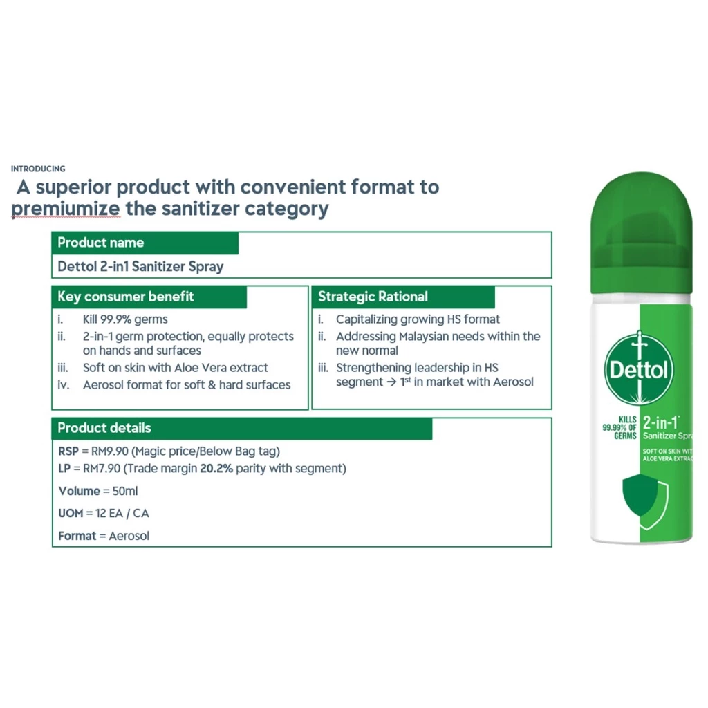 KILLS 99.9% OF GERMS: Dettol 2 in 1 Sanitizer Spray kills 99.9% of illness causing germs 2 IN 1 SPRAY: The sanitizer can be used to sanitize hands as well as surfaces