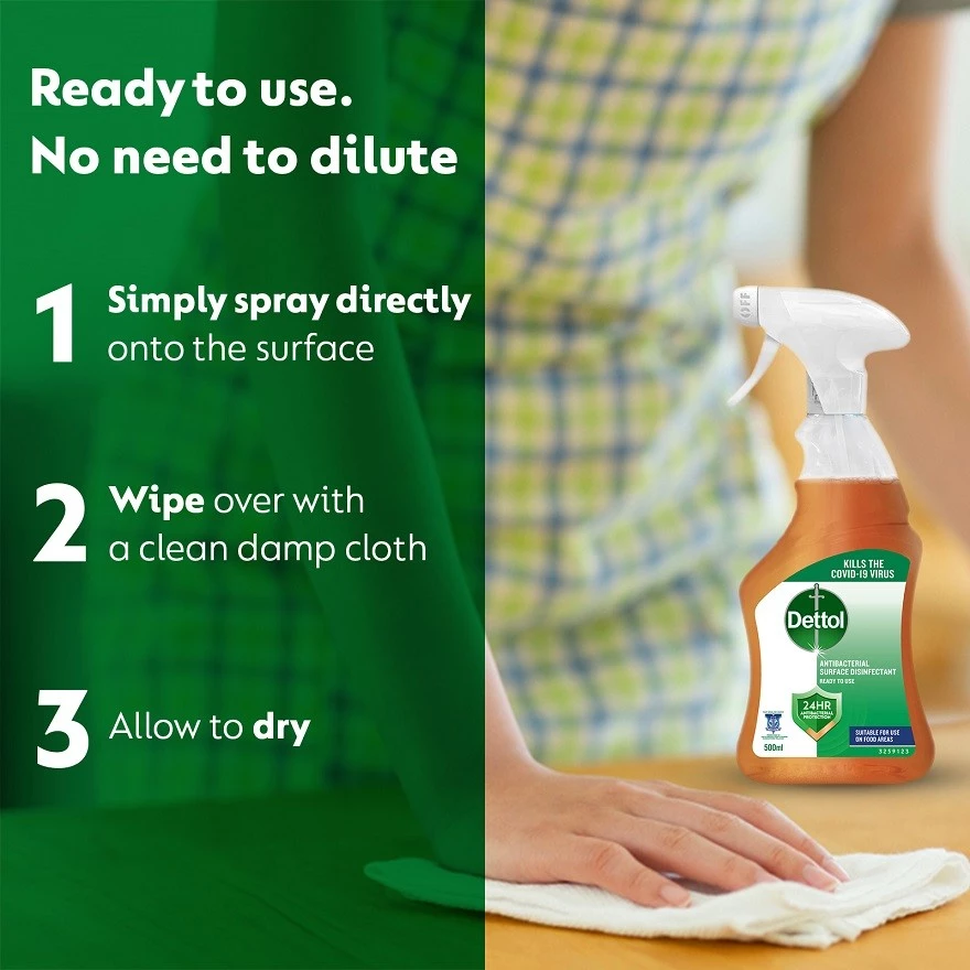 Dettol anti-bacterial disinfectant spray is used for cleaning products help to fight germs and bacteria all over the world to safeguard health through good hygiene. Powerful 3x cleaning performance against grease, dust, and dirt. Cleans floors, hard surfaces including marble, wood, porcelain tiles and linoleum better than ever. Leaves no visible residue. 100% Better Germ Protection Protects against infection from cuts, scratches, and insect bites