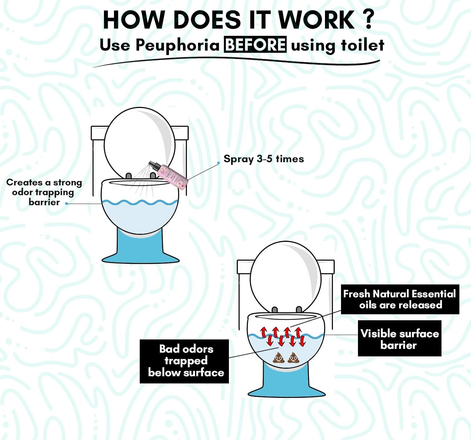 • Peuphoria pre poo spray for Toilet is 6x more economical than Bathroom Air Freshener sprays, sewer and septic safe and it really WORKS! Health, Cleanliness Enthusiasts and Individuals who value personal hygiene and cleanliness in their daily routine appreciates a product that keeps the bathroom smelling fresh and odor free.